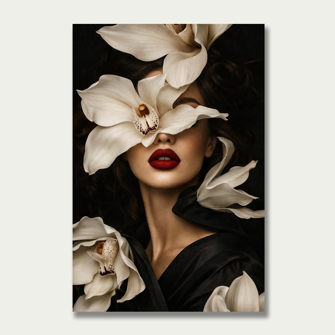 Een krachtig portret waarin diepe zwarttinten samenkomen met intens rode lippen. Red Lips in Noir staat symbool voor mysterie, elegantie en tijdloze vrouwelijke kracht. Een statement artwork dat direct de aandacht trekt en luxe uitstraalt.