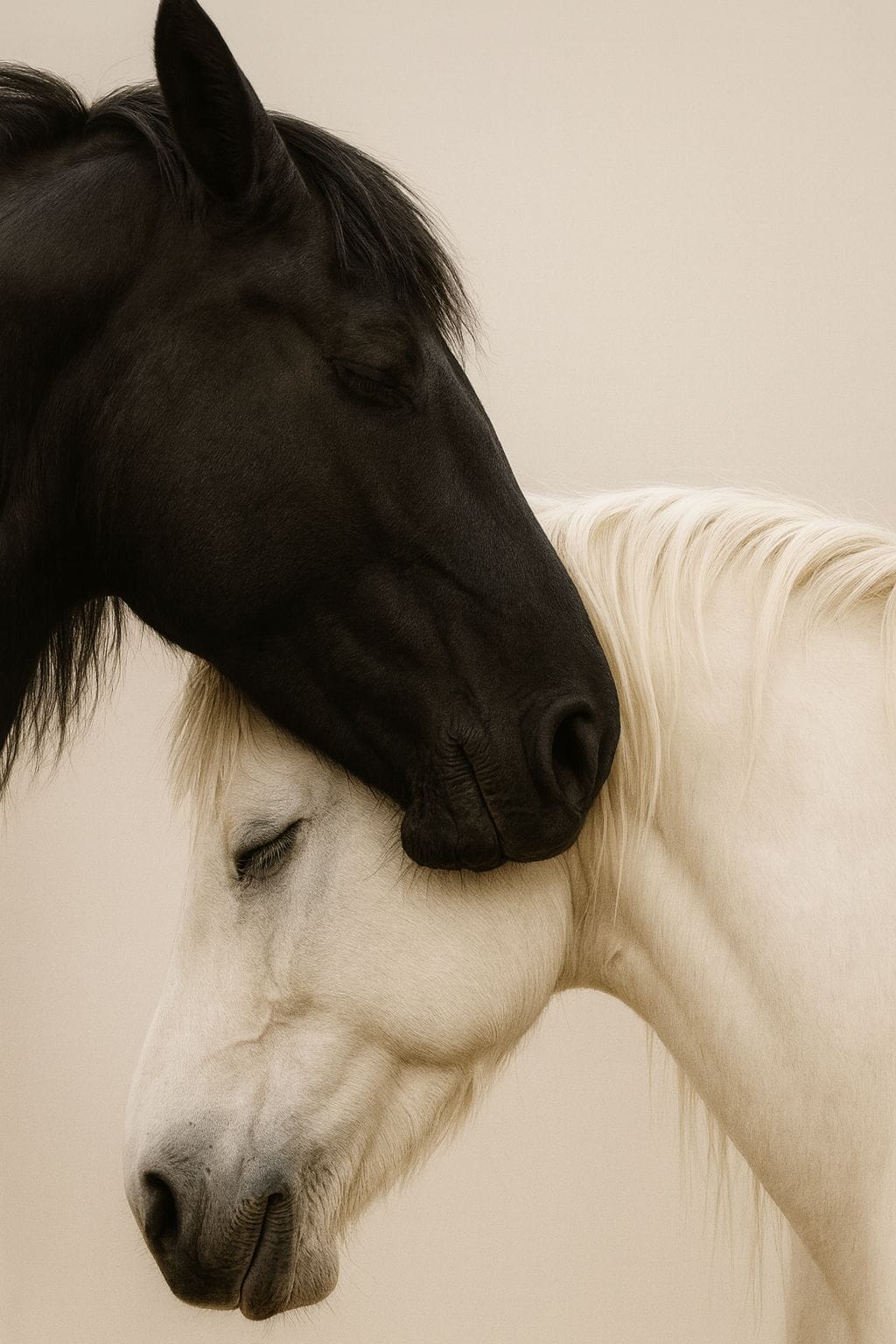 Exclusieve dierenwandkunst waarin twee paarden samensmelten in een moment van pure rust en verbondenheid. Een verfijnd kunstwerk dat zachtheid, kracht en emotionele diepte uitstraalt voor luxe en serene interieurs.